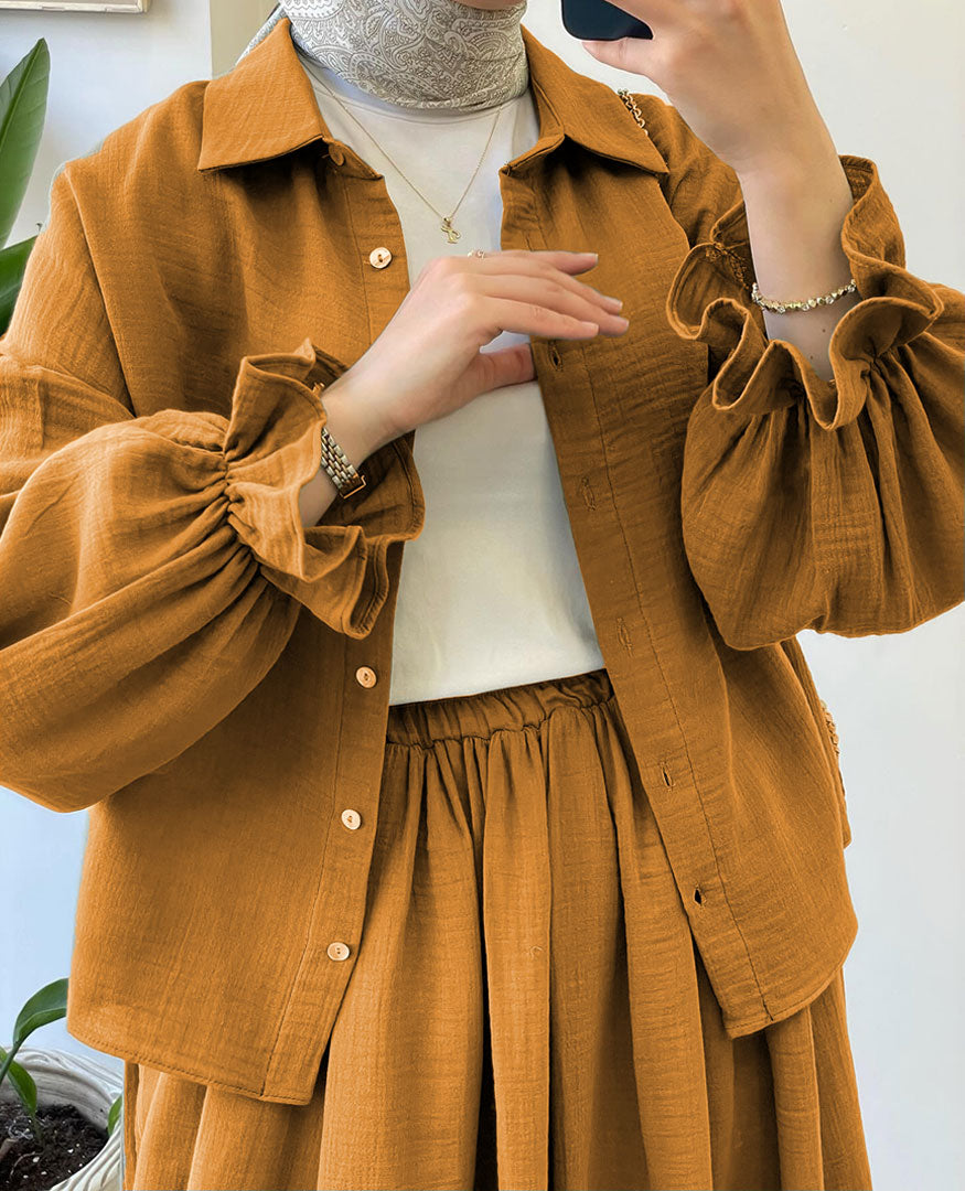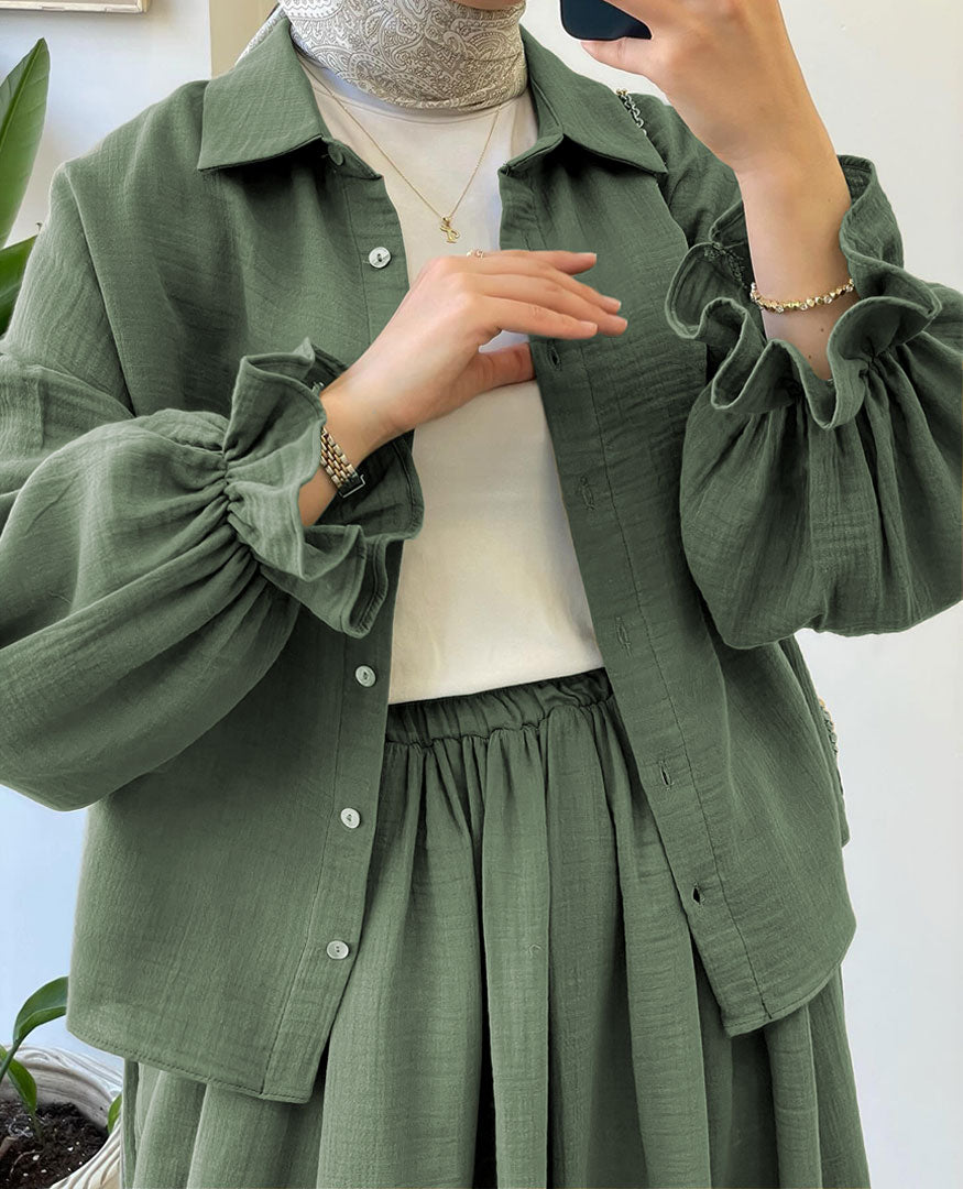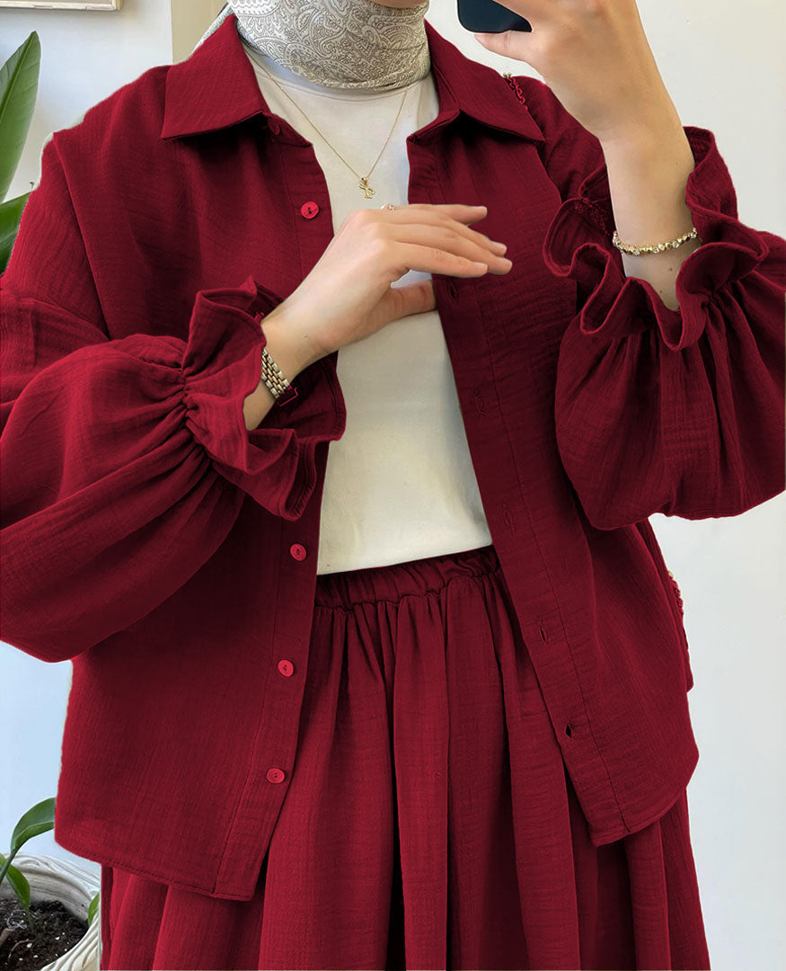 - Includes: Button-down top + full-length flared skirt
