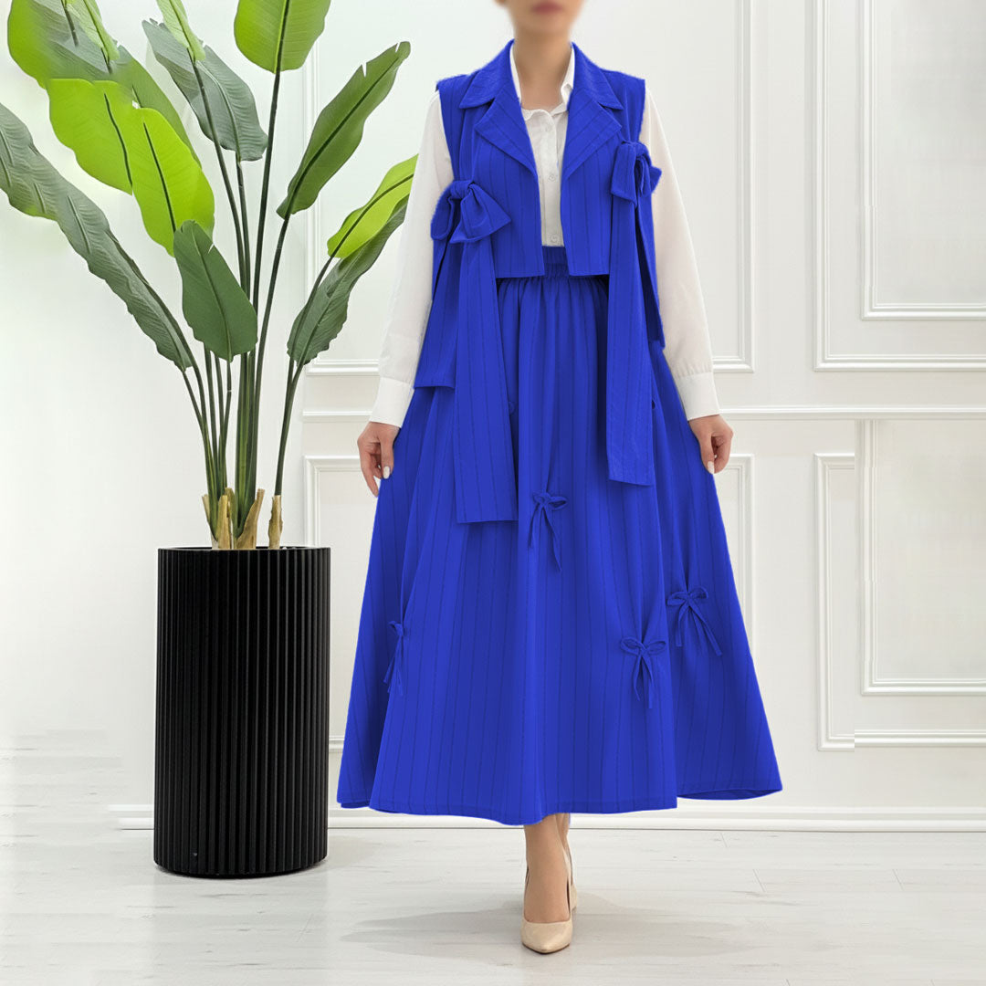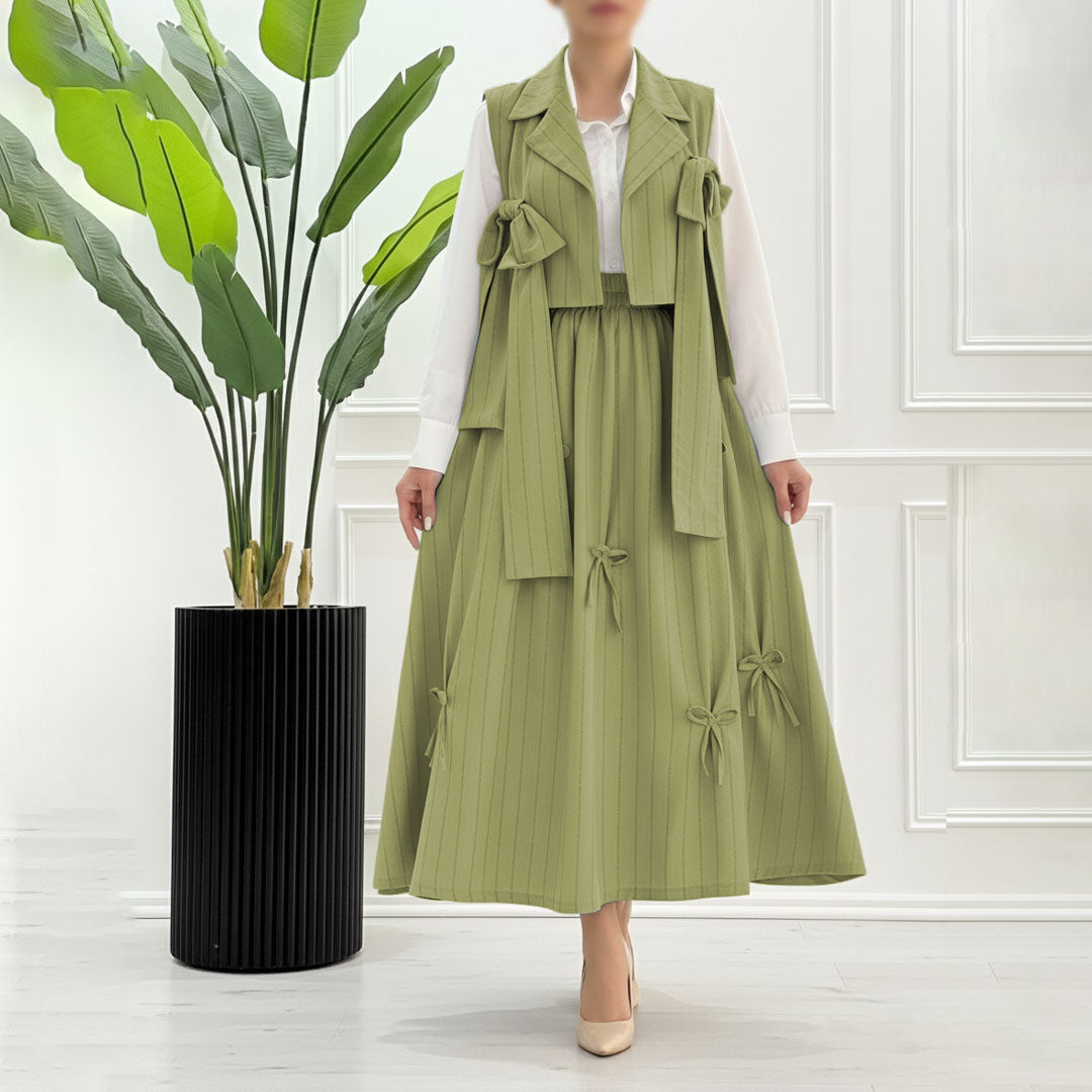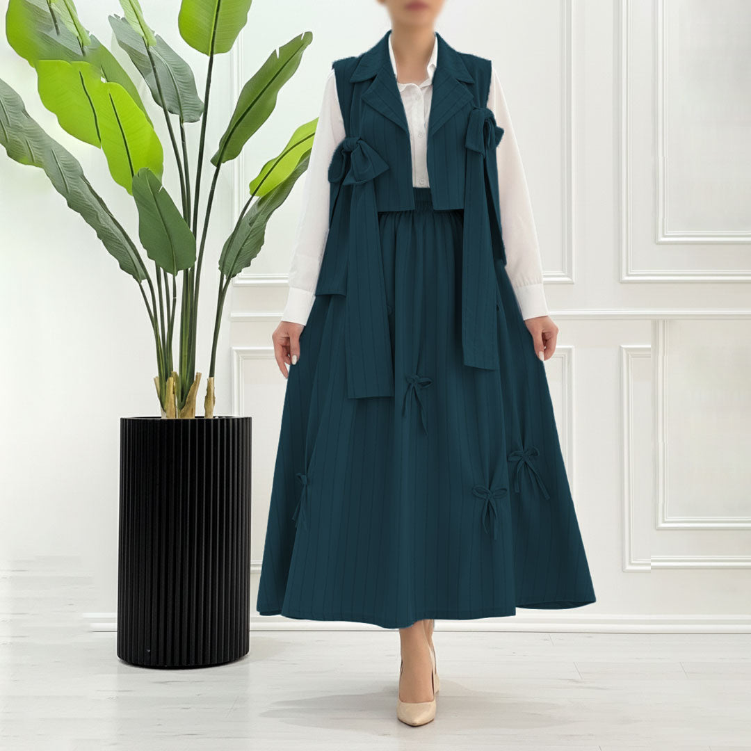 The Ribbon Charm Layered Set combines imported Georgette fabric with thoughtful construction for effortless elegance. This three-piece ensemble features a relaxed yet structured layered top paired with a coordinating inner shirt and skirt, designed to drape gracefully while maintaining modest proportions. The relaxed fit accommodates natural movement without compromising the refined silhouette. Perfect for those seeking versatile pieces that transition seamlessly from casual to formal occasions, this set delivers both comfort and sophistication in a single coordinated look.