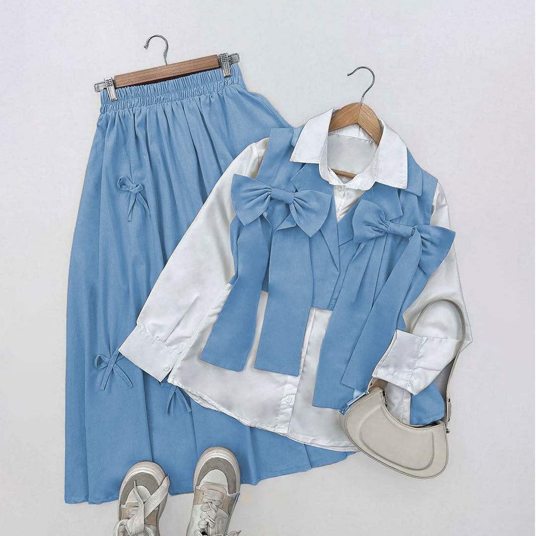 The Ribbon Charm Layered Set combines imported Georgette fabric with thoughtful construction for effortless elegance. This three-piece ensemble features a relaxed yet structured layered top paired with a coordinating inner shirt and skirt, designed to drape gracefully while maintaining modest proportions. The relaxed fit accommodates natural movement without compromising the refined silhouette. Perfect for those seeking versatile pieces that transition seamlessly from casual to formal occasions, this set delivers both comfort and sophistication in a single coordinated look.