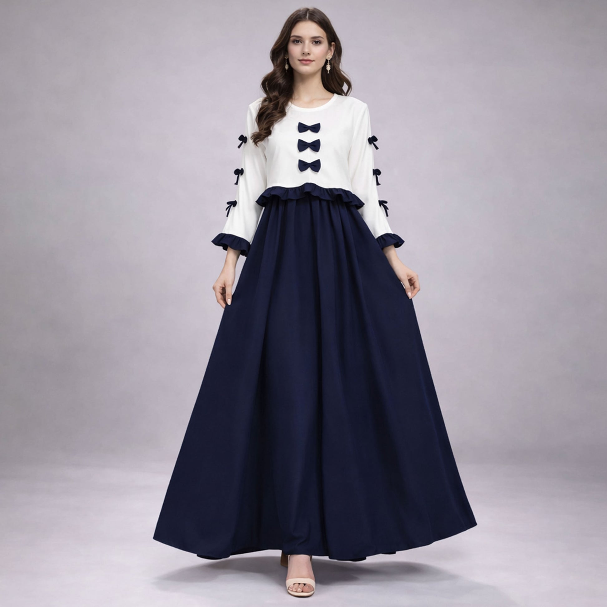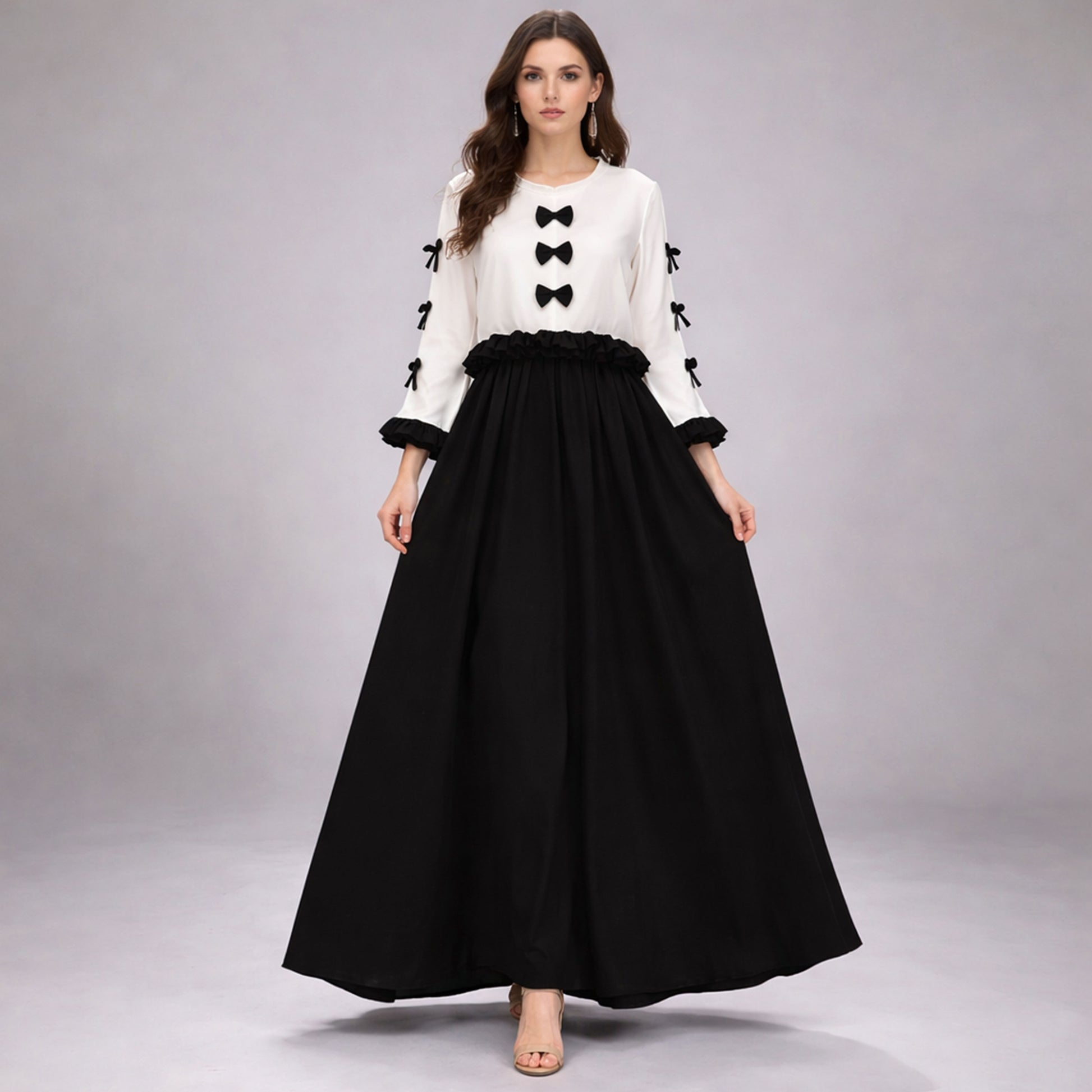 The Ribbon Tie Elegant Maxi Dress is thoughtfully designed for women who appreciate modest fashion with refined detailing. This exclusive two-piece outfit features a beautifully tailored top adorned with three ribbon tie accents on the front, adding a graceful and feminine touch. Additional ribbon tie details on the sides and sleeves enhance the overall elegance of the design.